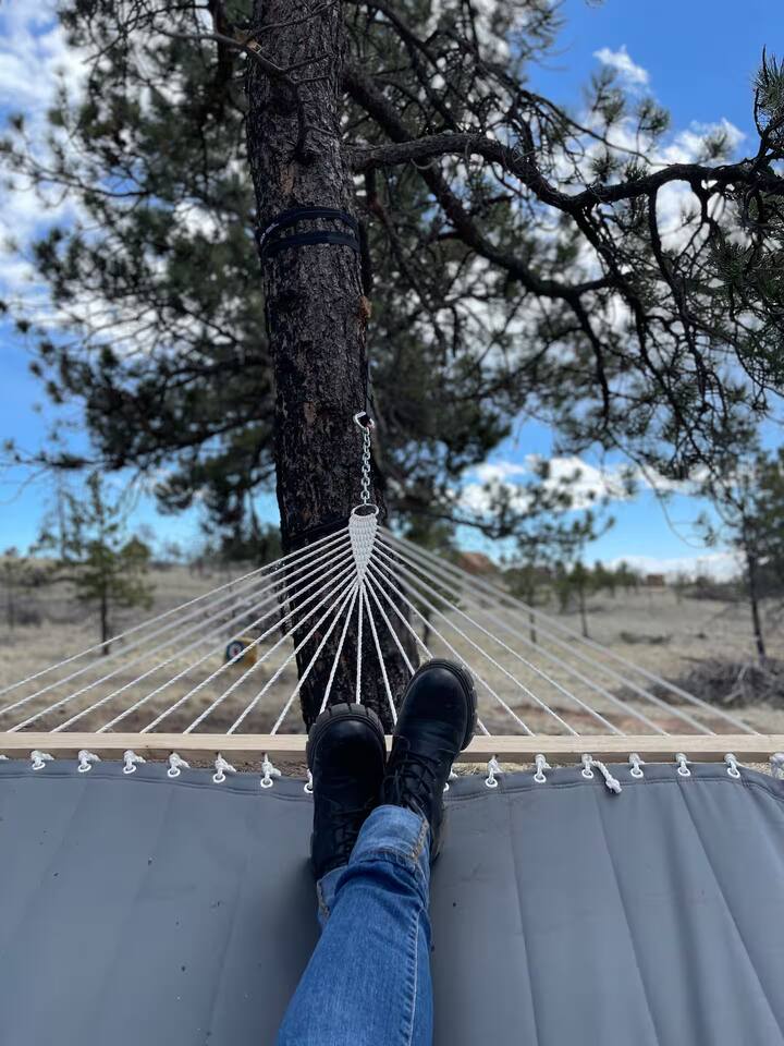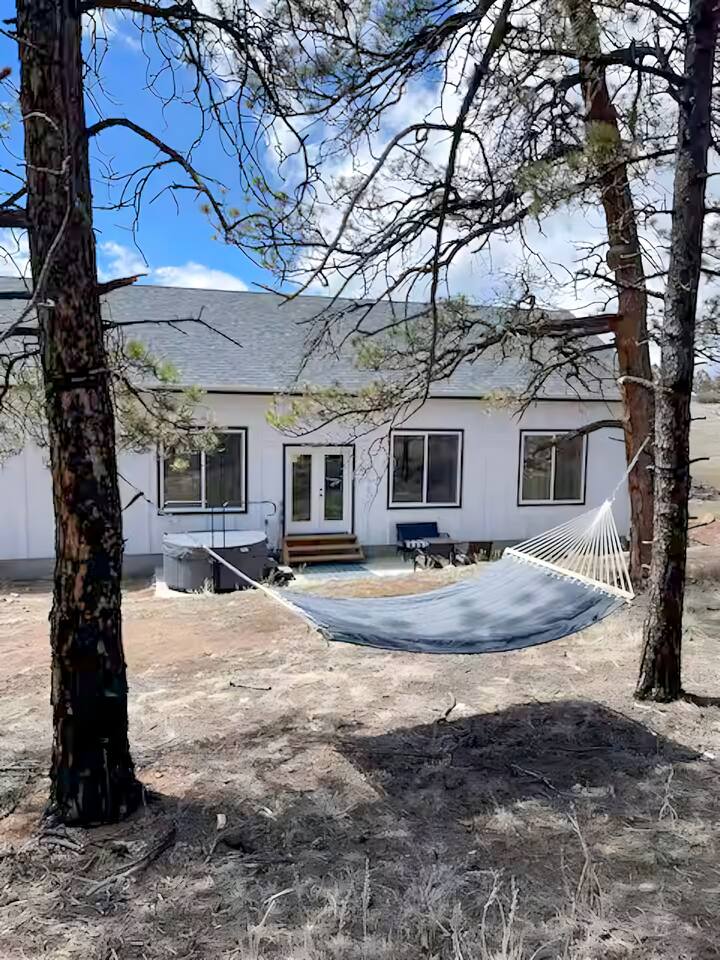 Welcome to Mountain Chic Escape! Just 14 miles from Cripple Creek where all the new casinos are, this serene retreat offers a hot tub & fire pit under starry skies. Experience quietude and witness sunsets from the large front deck. With soaring ceilings, 3BD, 2BTH for 8 guests on 2 acres, explore nature or visit nearby attractions like Florissant Fossil Beds and the Wolf Center. Whether seeking solace or thrilling escapades, create lasting memories in this idyllic mountain retreat! ⸻ ★ IDEAL FOR ★ • Families seeking space, comfort, and quiet—3 bedrooms, 2 baths, and room for 8 across 2 king and 2 full beds • Small groups who value open land, shared meals, and evenings around the fire pit or hot tub • Guests who enjoy stargazing, sunrise coffee, and a large social kitchen in a peaceful mountain setting • Parents traveling with little ones—Pack n’ Play, high chair, toys, and games make it easy to settle in • Outdoor enthusiasts who appreciate a private archery range, hammock lounging (available during the warmer months), and grilling on the back patio ⸻ ★ HOME TOUR ★ Master Bedroom 🛌 • King-sized bed • Expansive Windows Framing Wooded Views • Spacious walk-in closet with private en suite bathroom • Ceiling Fan • Futon • Black-Out Curtains • Smart TV 2nd Bedroom 🛌 • King-sized Bed • Closet with hangers • Bathroom located just across the hall • Black-Out Curtains • Ceiling fan 3rd Bedroom 🛌 • 2 Full-sized beds • Closet with hangers • Bathroom located just across the hall • Black-Out Curtains • Ceiling fan ⸻ ★ BATHROOMS ★ • Fluffy Towels, Washcloths, Make-up Towels, and Hand Towels provided • Hair Dryer in Each Bathroom • Shampoo, Conditioner, Body Wash, TP, and Hand Soap Provided Primary Bathroom 🚿 • Stand-up Shower • Double Vanity • Oversized Mirror • Attached Walk-In Closet 2nd Bathroom 🚿 • Shower/Tub Combo • Double Vanity • Oversized Mirror ⸻ KITCHEN 🍳 • Well-Equipped Open-Concept Kitchen • Keurig Coffee Maker, Tea, Hot Cocoa • Coffee Pods, Creamer, And Sweetener • Teapot, Toaster, and Blender • Cookware, Including Pots, Pans, Baking Dishes, And Crock-Pot • Storage Containers/Bags, Mixing Bowls, Dish Towels, And Knives • Full-Sized Refrigerator with Ice Maker • Essential Spices And Cooking Staples • Microwave • Assorted Glassware For Beverages And Wine • Gas Range ⸻ DINING 🍴 • Dining table that seats 8 • Barstools off kitchen countertop seats 3 ⸻ HOT TUB 🌊 • Stand-alone hot tub (seating for 6) • Included with the booking ⸻ OUTDOOR 🌲 • Fire Pit & Seating on Back Patio– Propane provided • Gas Grill & Utensils – Propane provided • Large Covered Porch – outdoor furniture • Hammock – Relax and unwind (provided in the warmer months) • Archery Range - Great for families and groups looking for outdoor fun ⸻ ENTERTAINMENT + WORK 🌟 • Smart TV in the living room • Log in to any app of your choice with your own login (there is no live TV at this time) • High-speed WIFI • Gas fireplace in the living room • Board games and puzzles • Poker Set ⸻ LAUNDRY 👕 • Washer and dryer in the home • Laundry detergent, stain treatment, and dryer sheets provided • Iron provided ⸻ ★ WHAT’S NEARBY ★ Outdoor + Recreation 🏞️ • Hiking (22–1hr & 20 min) – Explore Florissant Fossil Beds, Mueller State Park, and Pancake Rocks • Sledding & Ski Resorts (Under 2 hrs) – Monarch, Cooper, Breckenridge, Keystone, Vail, and Frisco Adventure Park Local Attractions📍 • Cripple Creek Casinos (27 min) – Enjoy gaming in a historic setting • Mollie Kathleen Gold Mine (31 min) – Descend 1,000 feet into an authentic gold mine • Cripple Creek & Victor Gold Mine (33 min) – A look into Colorado’s mining history • Ice Castles (28 min) – Typically open from January to March. Castle Ice Formations. • Rita the Rock Planter (34 min) – A giant wooden troll crafted from recycled materials • Colorado Wolf & Wildlife Center (25 min) – See and learn about wolves • Pikes Peak (57 min) – Iconic 14er reachable by car, hike, or cog railway. • Dinosaur Resource Center (38 min) – Fossils and prehistoric exhibits • Manitou Cliff Dwellings (1 hr) - Walk through reconstructed Ancestral Puebloan dwellings and explore museum exhibits • Cave of the Winds (1 hr) - Tour illuminated caverns or explore by lantern. Thrill-seekers can try zip lines, obstacle courses, and the Terror-Dactyl ride. • Sun Water Spa (54 min) - Relax in cedar soaking tubs filled with mineral-rich water, enjoy massage and skincare treatments, or join a yoga class in their open-air studio. Fishing 🎣 • Dream Stream (52 min) – Prime trout fishing in Lake George • Eleven Mile Canyon (30 min) – Scenic waters for anglers • Eleven Mile Reservoir (51 min) – Large fishing area with diverse catches • South Platte River – Deckers (1 hr 15 min) – Classic Colorado fly fishing Groceries 🛒 • Woodland Park (37 min): Walmart, Safeway, City Market, and Natural Grocers • Divide (30 min): The Market at Divide (small market) • Florissant (24 min): Florissant Mercantile (small market) • Cripple Creek (24 min): Cripple Creek Venture Foods (small market) Hospitals 🩺 • Hospitals – Pikes Peak Regional in Woodland Park (36 min) • UC Health in Colorado Springs (1 hr+) • Urgent Care Options in Colorado Springs (1 hr+) Airports ✈️ • Airports – Colorado Springs Airport (1 hr 16 min) • Denver International Airport (2 hrs 13 min) Colleges 🎓 • Charis Bible College (38 min) • UCCS (1 hr 10 min) • Air Force Academy (1 hr 22 min)
